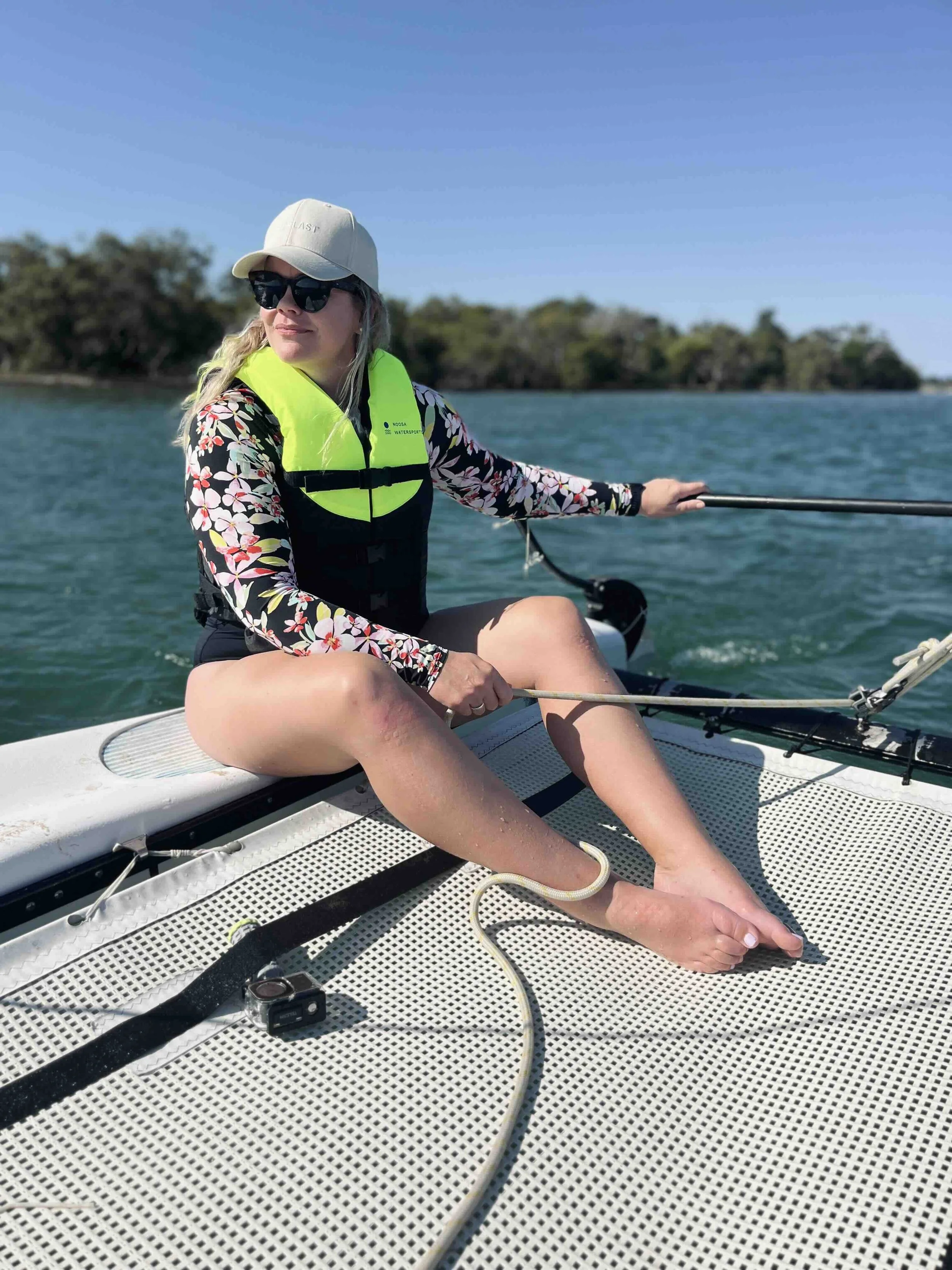 In my Noosa River sail, there was quite a strong current running, so we decided to sail upwind and against the current first — slowly tacking left and right around dozens of moored boats, jetskies and hire boats (who seemed to think zooming within 20m was ok?! - meaning lots of wake to bump through and lots of refreshing splash). Heading upwind first took a bit of time and gave us plenty of goes at tacking the boat through the wind. It was a bit frustrating for me when we’d stall (mostly because I’d turn the rudders hard, which we do in our monohull sailing) but we needed a slightly different technique on the Hobie. It was pretty exciting when we’d pick up speed quickly when sailing with the wind toward our side (close reaching). After we’d gone quite a way up wind, we knew it’d be a quick sail back down, when we turned with the wind and current running with us. And it was so absolutely awesome! So quick, and so fun!!!